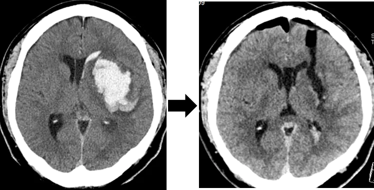 内視鏡による脳内血腫の除去 (左: 手術前 右: 手術後)