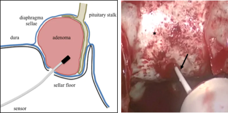 頭痛は視力視野障害、下垂体機能不全とともに下垂体腫瘍による症状の1つです。しかしながら、本疾患における頭痛の発生機序に関しては明らかな定説はありません。頭痛の発生機序としては腫瘍周囲の硬膜に分布する神経への圧迫や炎症の波及などが有力ですが、当科で治療された下垂体腫瘍のデータから頭痛の性状や腫瘍の画像的な特徴や腫瘍内圧の結果を解析してきました。下垂体腫瘍の一つであるラトケ嚢胞において、小さなサイズであっても炎症の波及によりに頭痛が惹起されと言われています。これを適切に手術することで頭痛を改善できることを明らかにしました (Fukui I et al. World Neurosurg 2017)。また、下垂体腺腫においてはトルコ鞍内圧と頭痛との関係に着目しました。経鼻的下垂体腫瘍摘出術中に脳圧センサーを用いて腫瘍内圧を測定し、その相関された結果とともに頭痛のメカニズムを報告しています (Hayashi Y et al. Neurosurgery 2019)。今後は手術を行う前に頭痛がどれくらい改善されるか予想できるような研究を目指しています。