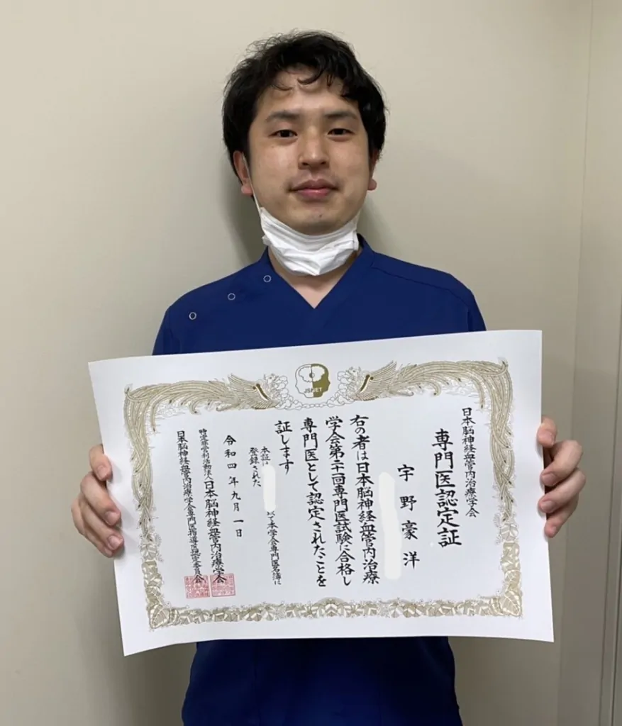昨年脳神経外科専門医試験に合格した際にも「専門医試験合格はゴールではなくスタート」というお言葉をいただきましたが、脳血管内治療専門医に関しても同様の気持ちです。また9月から「脳血管内治療専門医」を標榜できるようになりましたが、専門医の名の重責を感じております。 これから研鑽を積み、一流の脳血管内治療を提供できる医師を目指し、邁進していきたいと思います。
